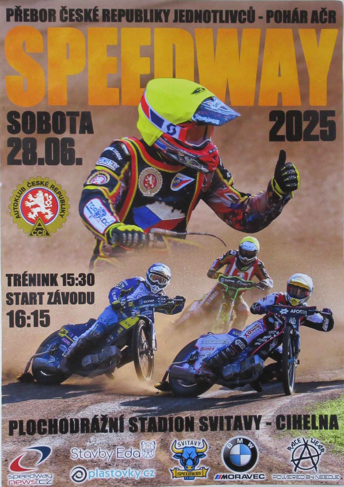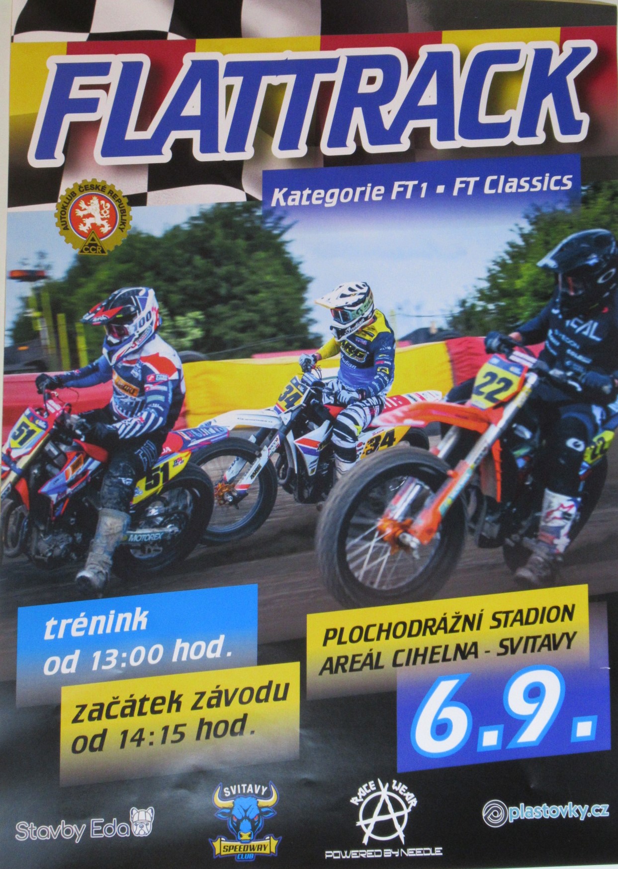 Závody MČR flat tracků aneb americká plochá dráha. A ano, závodí se ve 2 kategoriích o 2 vítězích a hromadě adrenalinu. Líbí ? Příjďte fandit a hecovat 6.9.2025 ve 14.00 hod., tréninky od 13.00 hod.. Změna programu vyhrazena.